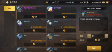勇气商店25勇气硬币可以购买1000泰拉,每天最多购买3次,只要勇气币够,每天3000泰拉。