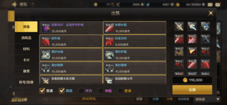 在游戏用,刷图我们会获得大量的蓝、白品质的无用装备,除了分解,我们也可以出售获得金币,装备等级越高,价格越贵。这个我们尽量在游戏后期出售,前期分解,获得无色晶块,保障无色技能消耗。
