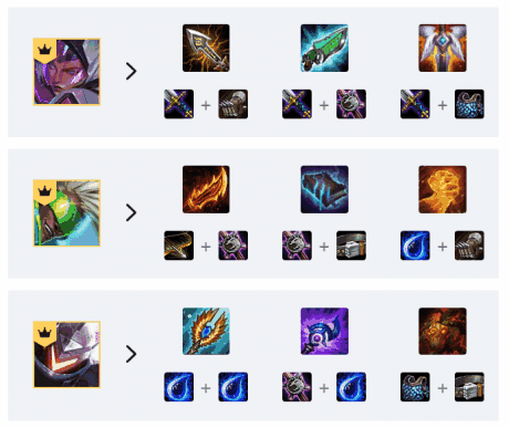 主C刀妹:无尽,科技枪秒人吸血,春哥容错。副C艾克:羊刀,鬼书,正义之手。其它每个源计划一个小件,有鸟盾给前排更好。