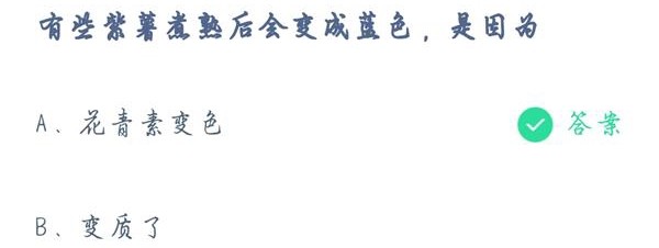 一般紫薯的颜色为深紫红色,有人在吃紫薯的时候会发现,紫薯煮熟后会变成蓝色,怀疑紫薯里面是不是添加了什么化学成分,不敢吃。今天蚂蚁庄园小课堂就是问大家,有些紫薯煮熟后会变成蓝色是因为什么?一起来看看吧。