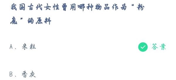 我们经常在古装电视剧中看到对着镜子化妆的大家闺秀,说明自古以来化妆术就存在,各种粉饼胭脂都是闺阁女子中常使用的。今天蚂蚁庄园小课堂就是问大家,我国古代女性曾用哪种物品作为粉底的原料?