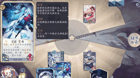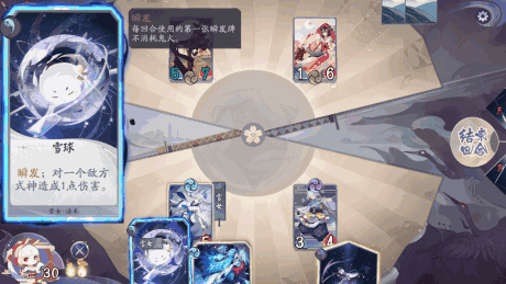 第一回合中敌方妖刀姬拥有较高力量和生命,很难击杀,也难以承受其高额的伤害,所以我们选择使用控制来限制妖刀姬的输出。优先使用雪女的法术牌“觉醒·雪女”来赋予雪女伤害附加眩晕的能力,再使用“雪球”来对妖刀姬造成伤害,使其进入“眩晕”状态。