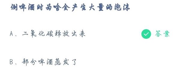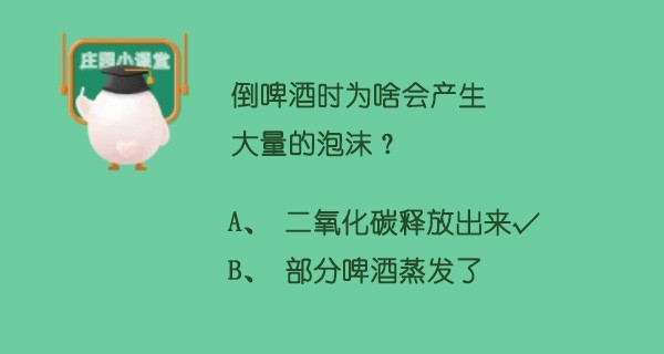 很多人在喝啤酒倒酒的时候,经常出现很多泡沫,而且很久消散不掉,优质的啤酒在喝完以后,杯子上还会残留一些泡沫,这些泡沫喝在嘴里就能感受到麦香味。今天蚂蚁庄园就是问大家,倒啤酒时为啥会产生大量的泡沫?