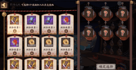 *贝壳架中超值奖励红色贝壳可供阴阳师大人自由配置,初始每次可配置六个红色贝壳,随着抽取轮数的增加,可选红色贝壳数会递增,上限9个