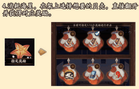 本次新增'海星',消耗'海星'可在架上选择想要的贝壳,直接翻开并获得对应奖励!