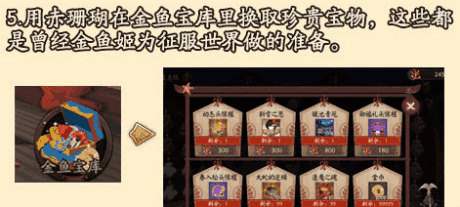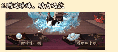 立岸聆海,初春远航。金鱼姬要出海远航环游世界了,请阴阳师大人为她的航行助力吧。珠光破海雾,将引路珍珠赠予金鱼姬,她会回应您的这份期待,翻开架上的贝壳作为回礼。当阴阳师大人赠予的珍珠到达一定数量时,会收到她在海上收集的赤珊瑚和海星,换取更多珍贵的宝物。