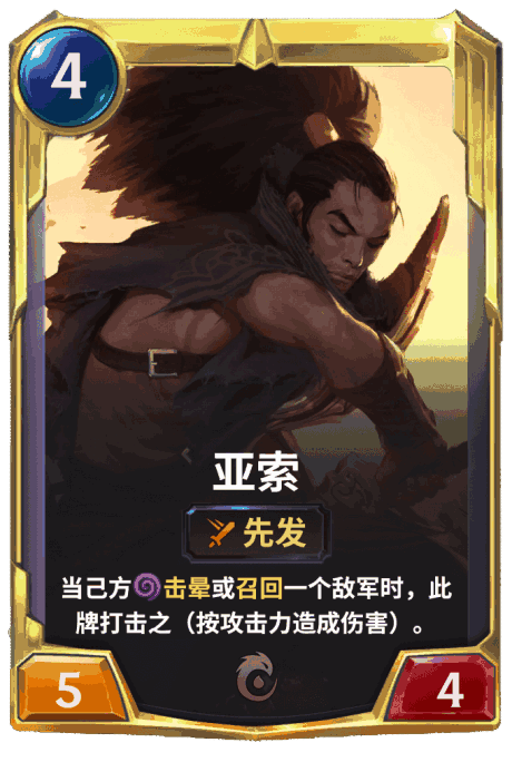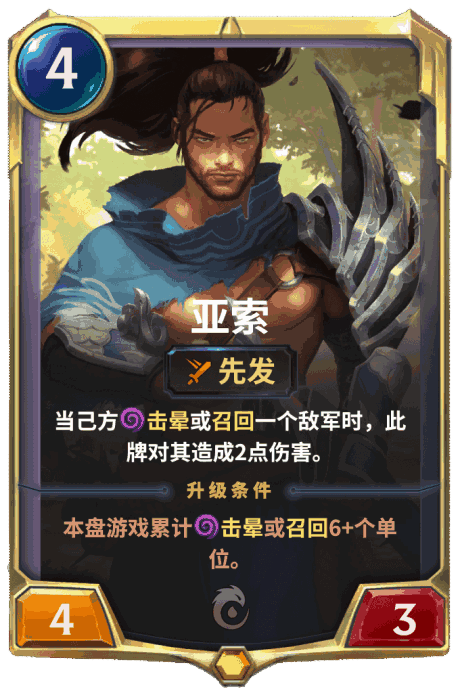 效果:快速 击晕一个正在攻击的敌军。 将一张亚索洗入己方牌库。
