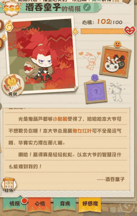 和【咬人的葫芦牙】一样,把红叶和酒吞拖到葫芦牙旁边,在他们玩的时候点击一下葫芦牙,就会出现这个彩蛋。