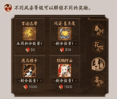 每个风姿等级将解锁独特的风姿商店,各位大人可以在商店中花费指定货币购买到风姿专属外观等奖励。