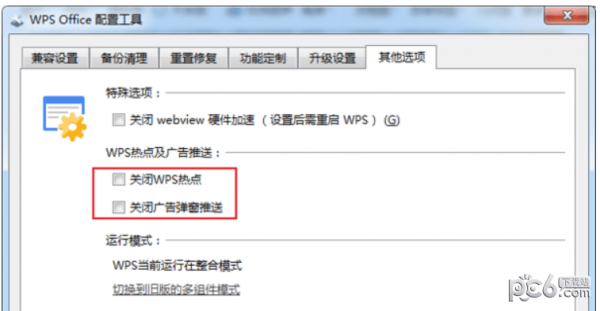 找到“WPS Office”的设置,进入“配置工具”,切换到“其它选项”,关闭掉“WPS热点及广告推送”的勾选即可。