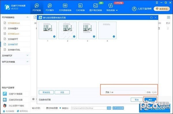 当PDF文件被成功导入后,这时我们可以看到这份文件的【页数】为【4】,点击【页码选择】下方的【全部】,就可以进入到选择转换的页面,将需要转换的页码进行设置后,点击【确认】按钮即可。