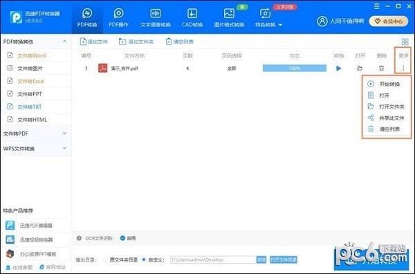 在等待转换的过程中,我们如何判断已经完成转换了呢?其实可以看【状态】下方的进度条,当显示【100%】时,就表示PDF文件成功转换为TXT格式了。当完成转换后,可以点击【更多】下方的按钮,对转换后的文件进行【打开】或【共享此文件】操作。