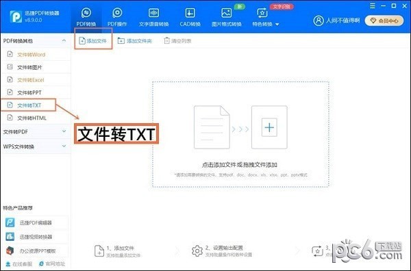 在电脑中打开安装好的软件后,我们需要找到相对应的功能。在上方的功能栏中选择【PDF转换】,然后点击【PDF转换其他】中的【文件转TXT】功能,这时就进入到了【文件转TXT】功能界面,点击【添加文件】按钮就可以将PDF文件进行导入了。