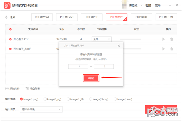③将需要转换的一个或多个PDF文件拖入页面中,或在框内“单击”来添加文件,或点击【添加文件】按钮;可点击页码选择,自由选择需要转换的页面范围;