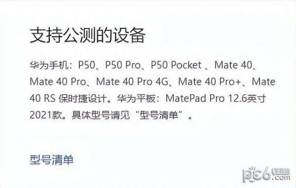 华为手机:P50、P50 Pro、P50 Pocket 、Mate 40、Mate 40 Pro、Mate 40 Pro 4G、Mate 40 Pro+、Mate 40 RS 保时捷设计。华为平板:MatePad Pro 12.6 英寸 2021 款。具体型号请见“型号清单”。
