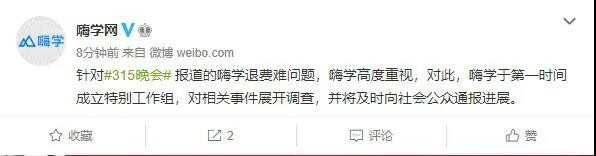 嗨学网官方回应称,针对3·15晚会报道的退费难问题,嗨学高度重视,对此,嗨学于第一时间成立特别工作组,对相关事件展开调查,并及时向社会报进展。