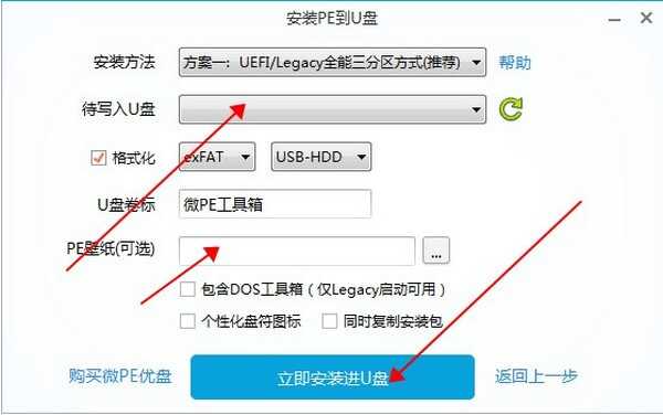 3、然后打开软件,插入u盘,在“待写入u盘”中选择自己的u盘,再点击“立即安装进u盘”。