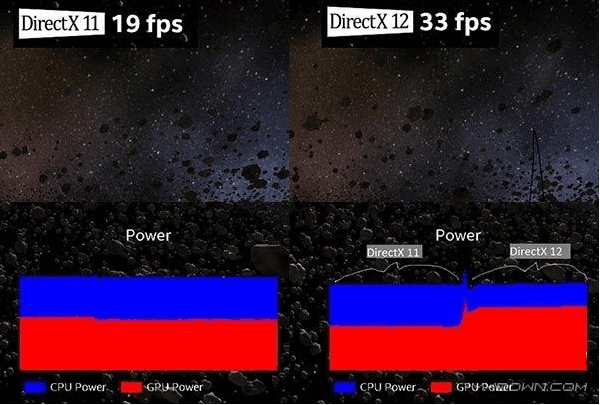 具体而言,英特尔演示了一段游戏Demo,在DirectX 11下只有 19FPS 的帧数,而在DirectX 12下却上升了33fPS。也就是说,在使用完全相同的硬件时,DirectX 12相比DirectX 11的游戏性能提高了70%左右。