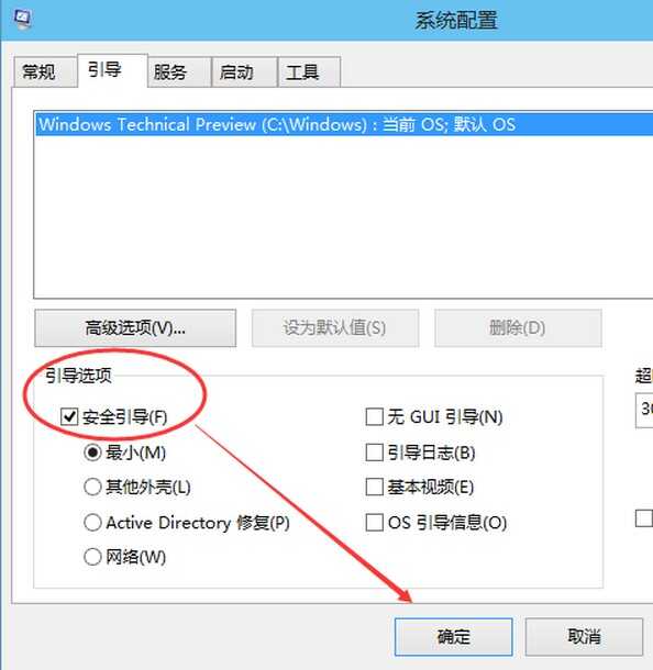 在引导选项卡窗口下,将引导选项下的安全引导(F)勾中,然后点击确定,如下图所示。