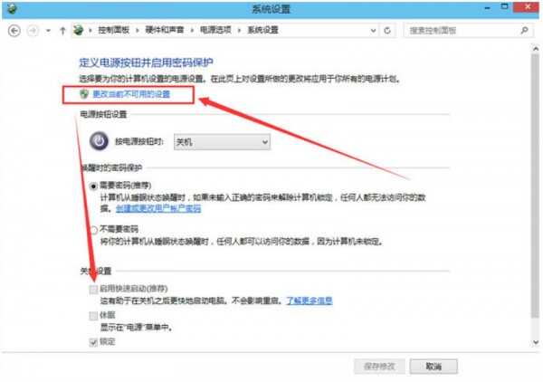 出来这个界面,就更改当前不可用的设置,专门修改箭头指向的启用快速启动。PS:这个是小编取消完后截的图,这个默认是开启的。