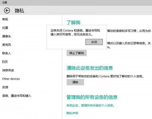 在弹出的窗口中点击“停止了解我”按钮和“清除”按钮。其实这一步就是切底关闭了微软小娜Cortana和清除了其本身的记录。这就是怎样激活微软小娜的方法,既然你的开关按钮是灰色的,我们不能选择,那我们就干脆直接关掉你。任何事情也就是如此,反其道而行,或许还能走出一条阳光大道的。如图所示: