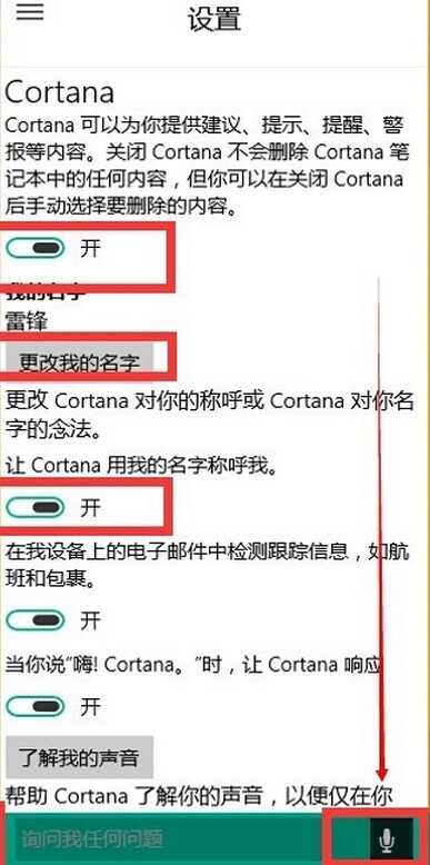 当你关掉了微软Cortana之后,你再次回到桌面,从以上我们说的第六步开始,点击Cortana的窗口,再次进入设置窗口,这时你会发现开关微软小娜的按钮已经高亮了,正在等待着你的选择,你会毫不犹豫的开启她,如图所示:
