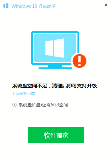如果检测不通过则会有相应提示;如果系统盘空间不足可通过电脑管家“软件搬家”功能进行扩充空间;