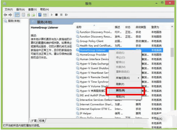 找到“HomeGroupListener”服务,双击打开或右键单击“属性”命令。