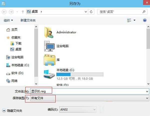 2、然后另存为 显示IE.REG文件,文件类型要选择【所有文件】;如下图所示;