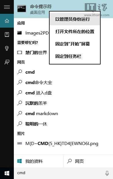 ①在Cortana搜索栏输入CMD,然后在第一个结果点击右键,选择“以管理员身份运行”