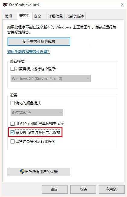 方法:进入《星际争霸》游戏文件夹根目录,找到StarCraft.exe(或Brood.exe)文件,单击右键进入“属性”,然后选择“兼容性”选项卡,勾选“高DPI设置是禁用显示缩放”,然后点击“确定”即可。
