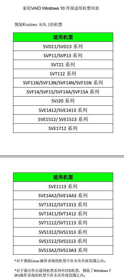 下面是索尼VAIO个人电脑Win10升级适用支持机型的具体列表