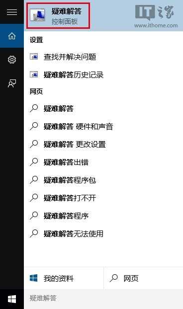 1、在Cortana搜索栏输入“疑难解答”,选择第一项