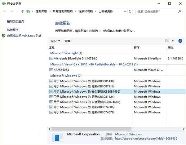 卸载方法很简单,点击设置→更新和安全→高级选项→查看更新历史记录→卸载更新,然后在弹出的窗口中找到KB3081436后,双击卸载即可。