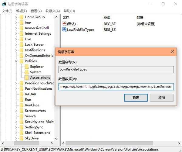4、双击LowRiskFileTypes,在数值数据中输入(复制粘贴即可,注意不要丢失任何标点)以下内容后,点击确定: