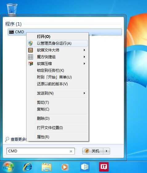 ① 在搜索框中输入CMD后,选择第一个结果,并在上面单击右键选择“以管理员身份运行”,如下图——