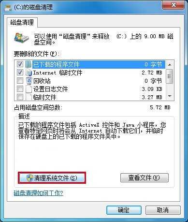 5、运行磁盘清理程序,并选择清理系统文件(如下图);