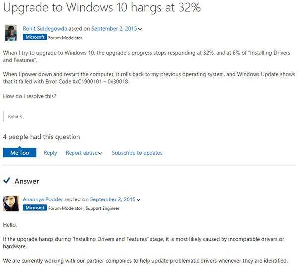微软社区的一位论坛版主、支持工程师Anannya Podder对此问题给出了解决方案,称该问题是由不兼容的驱动或者硬件所导致。她表示,微软目前正在与相关硬件厂商合作,争取早日解决各种兼容性问题。