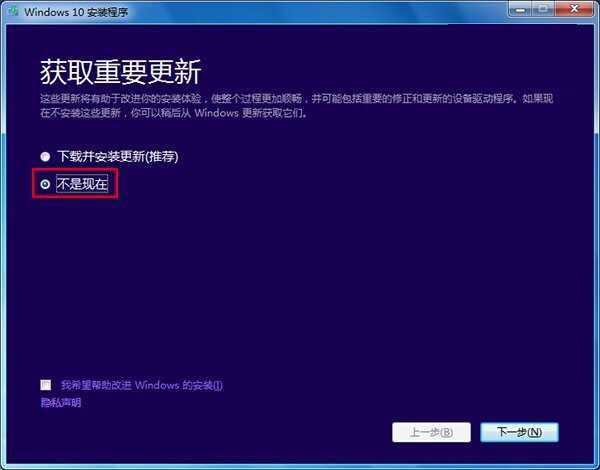 8、在升级开启后,不要选择“下载并安装更新”,而应该选择“不是现在”(如上图),避免任何自动安装驱动可能导致的兼容性问题。