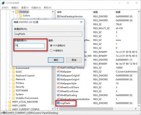 4. 找到LogPixels(如果没有就新建一个“DWORD (32位)值”,命名为LogPixels),将LogPixels修改为所需放大的百分比数值,注意十六进制与十进制的转换(括号内为十进制的放大百分比,括号外为十六进制的放大数值,例如想放大到120%,就填写78):78(120%),7D(125%),96(150%),C8(200%),如下图——