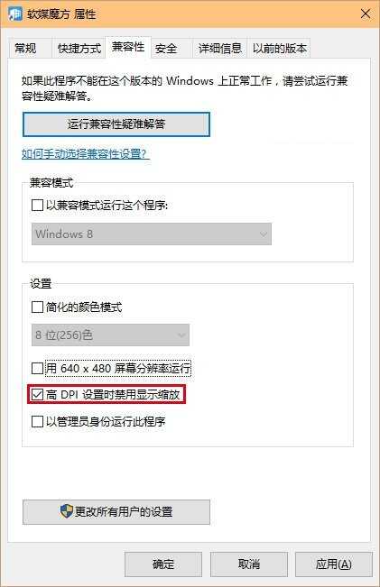 2、点击“兼容性”,勾选“高DPI设置时禁用显示缩放”,点击“确定”(如上图);