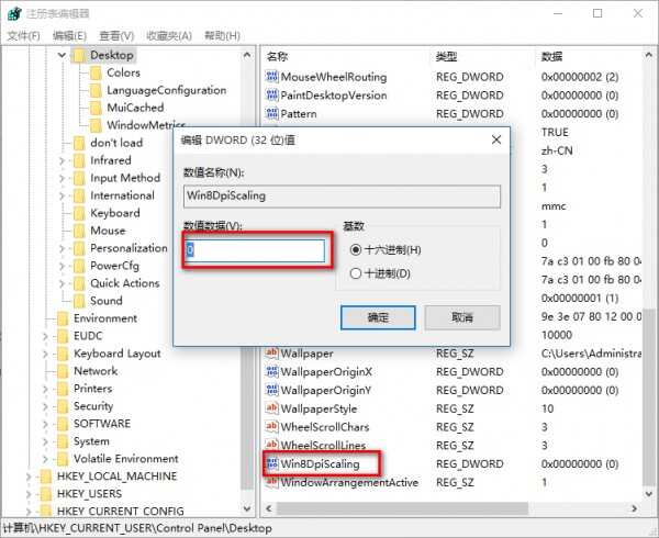 3. 找到Win8DpiScaling,将数值数据修改为1(如下图);