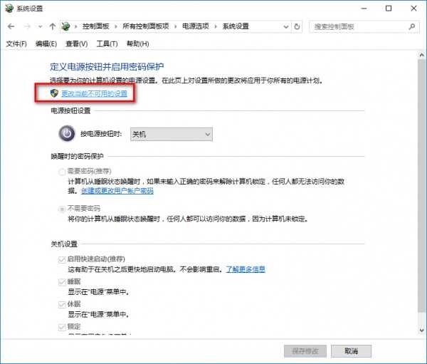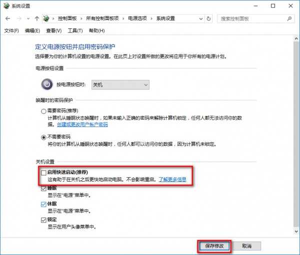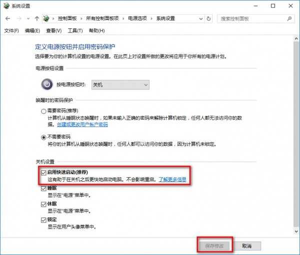 设置了能够顺利关机后,我们再开机,在系统设置窗口,左键点击:启用快速启动,在前面小方框内打上勾(不影响关机),再点击保存修改。