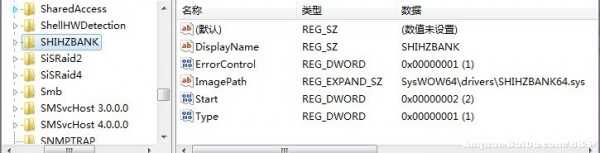 请点击开始-运行,输入regedit打开注册表后定位到HKEY_LOCAL_MACHINE\SYSTEM\CurrentControlSet\Services下,点击编辑-查找,输入shihzbank64.sys,搜索到的键中ImagePath字段就是驱动文件具体目录,如图所示