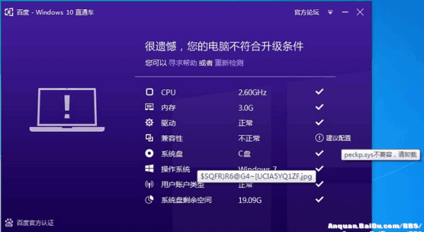 百度Win10 直通车上线后,发现部分用户在使用中出现在检测时候提示 peckp.sys这个驱动不兼容问题,如下图,可参考下面的操作方法解决。