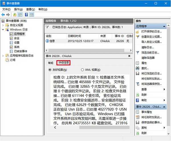 在Win8.1/Win10中,磁盘检查详细信息并不像Win7及以前系统那样在过程中直接给出,这使得某些专业用户很难直接了解检查结果。微软这样安排可能和更新日志详细内容不面向普通用户开放一样,为大多数用户“减轻负担”。不过,如果你的确需要查看这些日志,可以到“事件查看器”中进行搜寻,而且并不麻烦。