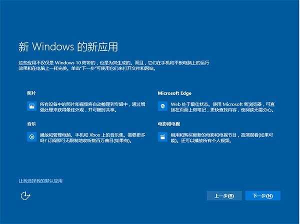 ▲为新用户简要介绍Win10的新应用,可在左下角选择默认应用。点击“下一步”继续