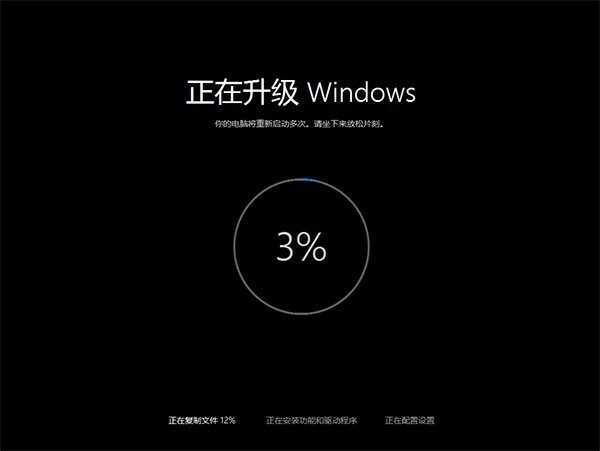 ▲系统重新评估安装条件后,会再次打开“准备就绪”页面,此时点击“安装”即可出现上图的安装进行中界面。如果你选择保留所有内容升级,这将可能是一个比较耗时的过程,大约需要1小时以上,其间电脑会自动重启两次以上