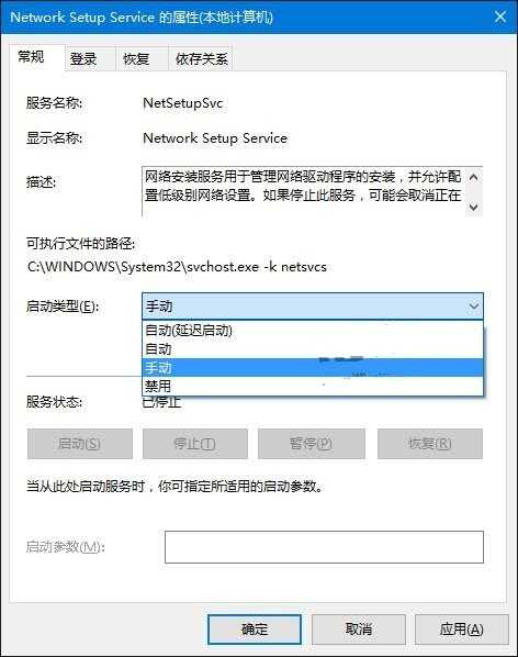 • 找到名为Network Setup Service的服务项,右键单击打开“属性”。
