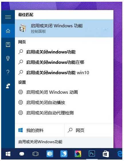 1、在任务栏搜索框中输入“启用或关闭Windows功能”,打开找到的项目;